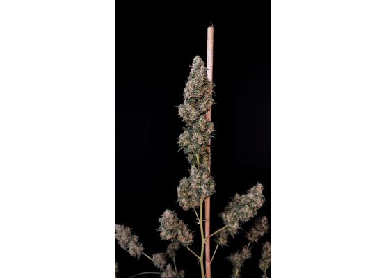 Ertraglich sind bei guter Pflege indoor etwa 400–550 g/m² erreichbar, outdoor typischerweise 60–150 g pro Pflanze. Die Struktur zeigt einen dominanten Hauptcola mit kräftigen Seitenästen und dicken Indica‑Blättern. 🌱