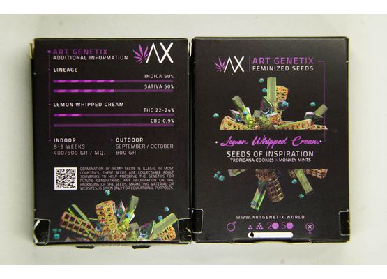 Lemon Whipped Cream von Art Genetix ist ein 50/50-Hybrid (Tropicana Cookies F2 × Monkey Mints) mit sahnig-zitronigem Dessertaroma und belebend-kreativer Wirkung. Blüht in 8–9 Wochen und liefert etwa 400–500 g/m².