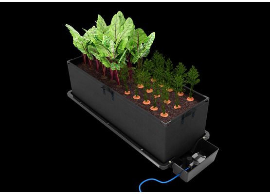 Mit nur einem Tray lassen sich fünf unterschiedliche Kultivierungs-Varianten realisieren: klassische Töpfe, Saatgut-Schalen, Growbags, Microgreen-Schalen oder ein großer 23,5 Gal (89 L) Stoff-Pflanzbehälter für Wurzelgemüse und living soil Anwendungen 🌱. Durch den Einsatz von capillary spikes, capillary matting oder dem Stoffbehälter kann die Feuchtigkeit gezielt und gleichmäßig verteilt werden.