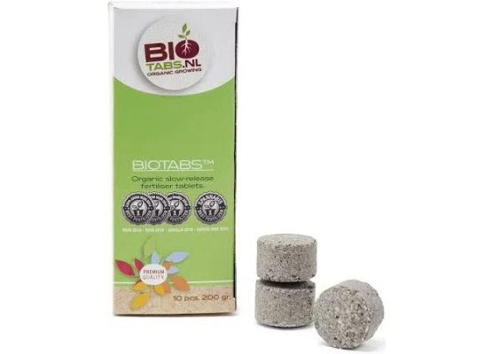 BioTabs sind 100% organische Langzeitdünger-Tabletten mit NPK 15-7-8, die speziell für einjährige Pflanzen entwickelt wurden. Jede Tablette wiegt ca. 21 Gramm und enthält eine ausgewogene Mischung aus langsam wirkendem organischem Stickstoff, Knochenmehl, Blutmehl, Federmehl, Fischmehl, natürlichen Humin- und Fulvinsäuren sowie nützlichen Bodenbakterien.
