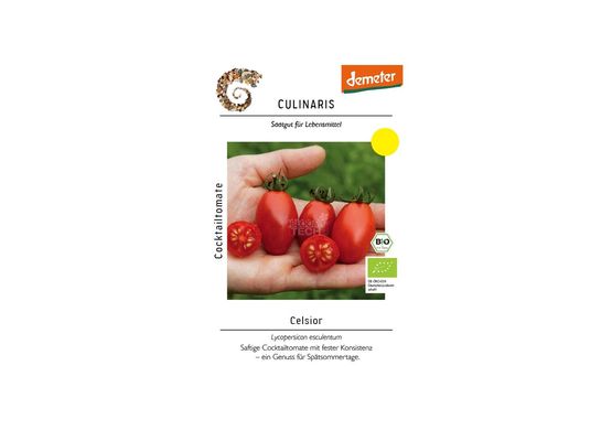 Die Cocktailtomate Celsior ist eine robuste Freilandtomate mit saftigen, tropfenförmigen Früchten von ca. 12 g. Sie überzeugt durch festen Biss, intensives Aroma und hohe Erträge auch im Spätsommer.