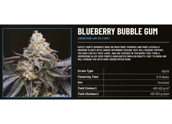 Blueberry Bubble Gum von Cookies (London Pound Cake #75 × Runtz) ist ein ertragsstarker Hybrid mit 8–10 Wochen Blüte und auffällig frostigen, teils violett gefärbten Buds.