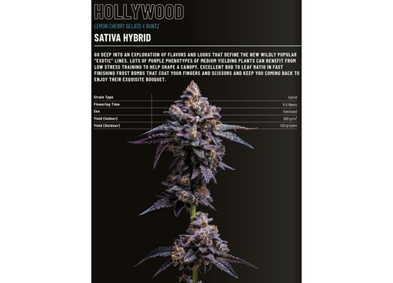 Hollywood von Cookies ist ein Hybrid aus Lemon Cherry Gelato x Runtz mit schneller 8–9‑wöchiger Blüte und hoher Harzproduktion. Häufig treten violette Phänotypen auf, mit sehr gutem Bud‑Leaf‑Ratio und attraktivem „frostigem“ Finish.