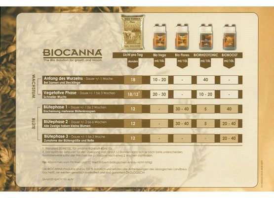 Die Bioserie von Canna. Biologischer Anbau drinnen für die gesündeste Art Pflanzen aufzuziehen. In diesem Düngeschema steht genau wieviel von welcher Komponente wann eingesetzt werden sollte.