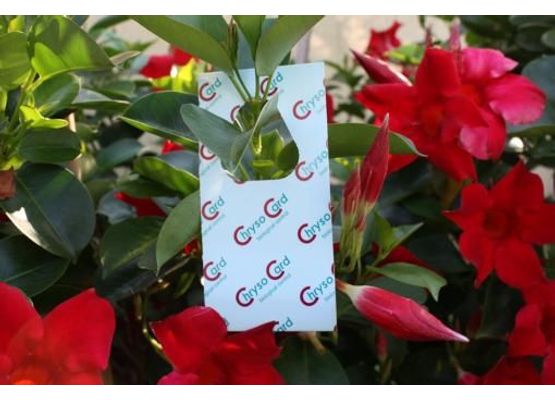 Eine ChrysoCard mit je 50 Florfliegeneiern und Futtervorrat.