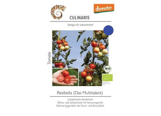 Resibella wurde von Bernd Horneburg in Göttingen biodynamisch gezüchtet und von Culinaris biovermehrt. Sie ist eine mittelspäte, wüchsige Freilandtomate mit glänzenden roten, runden Cocktailfrüchten (ca. 50 g) und zeigt ein hohes Ertragspotenzial. Sehr robust gegen Phytophthora (Kraut- und Braunfäule). 🍅