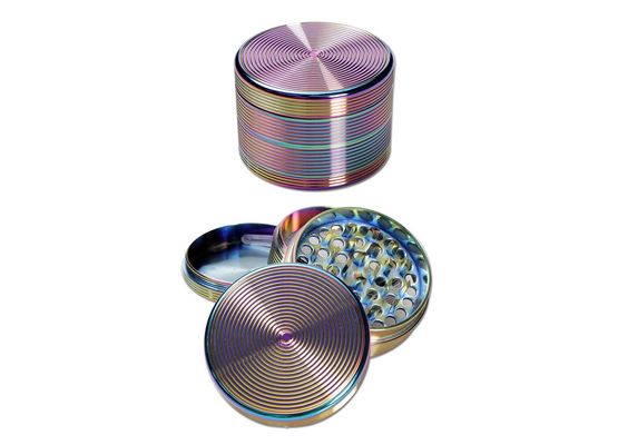 Vierteilige Kräutermühle /-grinder aus Metall in bunten Ölfarben mit magnetisch schließendem Deckel, Nylon-Gleitring, integriertem Sieb und Schaber.