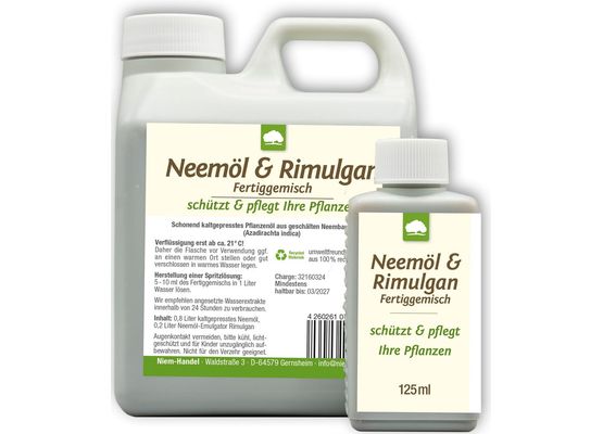 Neem Oil & Emulsifier Rimulgan ist eine fertig gemischte, flüssige Pflanzenlösung auf Basis von kaltgepresstem Neemöl und dem biologisch abbaubaren Emulgator Rimulgan. Durch die Kombination mit Rizinusöl entfällt das zeitaufwändige eigenständige Vermischen von Öl und Wasser. Sie können das Konzentrat direkt verwenden und einfach mit lauwarmem Wasser ansetzen, um ein wirksames Neemölspray herzustellen.
