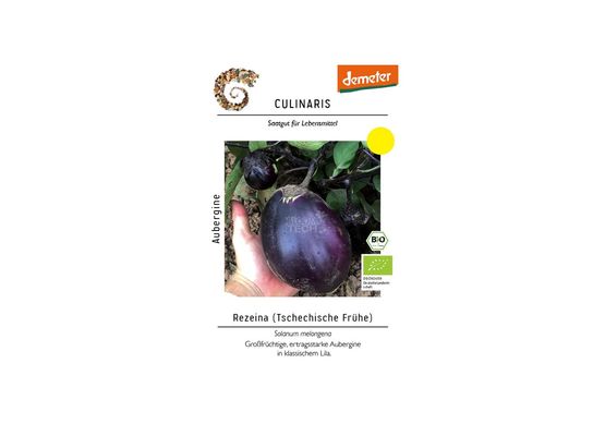 Rezeina (Tschechische Frühe/PP1012) ist eine alte, ertragsstarke Solanum melongena-Sorte mit kompakten Pflanzen und großen, klassisch lilafarbenen Früchten (bis 15 cm). Sie zeichnet sich durch frühe Reife und gute Erträge auch in kühleren Lagen aus.