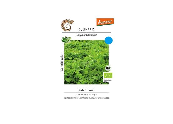 BIO-Schnittsalat Salad Bowl stammt von Culinaris Saatgut und ist nach EU-Bio-Standard DE-ÖKO-006 zertifiziert 🌱. Die Sorte bildet als einzelne Pflanze große Rosetten und kann sowohl als Pflücksalat als auch als Kopf geerntet werden ☀️. Die leuchtend grünen, gewellten Blätter sind besonders zart und entwickeln einen feinen, nussigen Geschmack.
