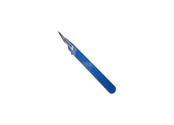 Steril verpacktes Einwegskalpell mit Kunststoffgriff, Klinge nicht wechselbar.