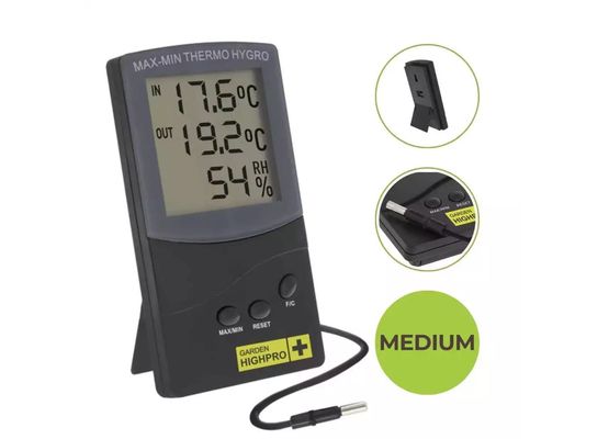 Das Thermo-Hygrometer digital Medium ist dein zuverlässiger Partner für ein perfektes Grow-Klima. Dank der externen Sensorführung misst du exakt dort, wo deine Pflanzen stehen, und reagierst sofort auf Schwankungen. Perfekt für Hobby- und Profigrower! 😊